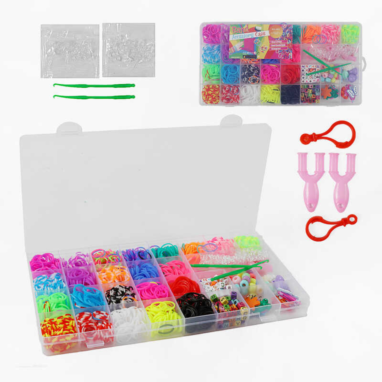 Особливості: Набір представлений у вигляді прозорого розкладного боксу із відділеннями. Містить 23 види кольорових резиночок. Гачок для плетіння, карабіни, рогатки, пластикова фурнітура для зєднання. Кольорові намистини та англійські букви, підвіски. Розвиває дрібну моторику, посидючість та уяву. Резинки виготовлені з високоякісної гуми, яка забезпечить міцність і довговічність вашого виробу.
