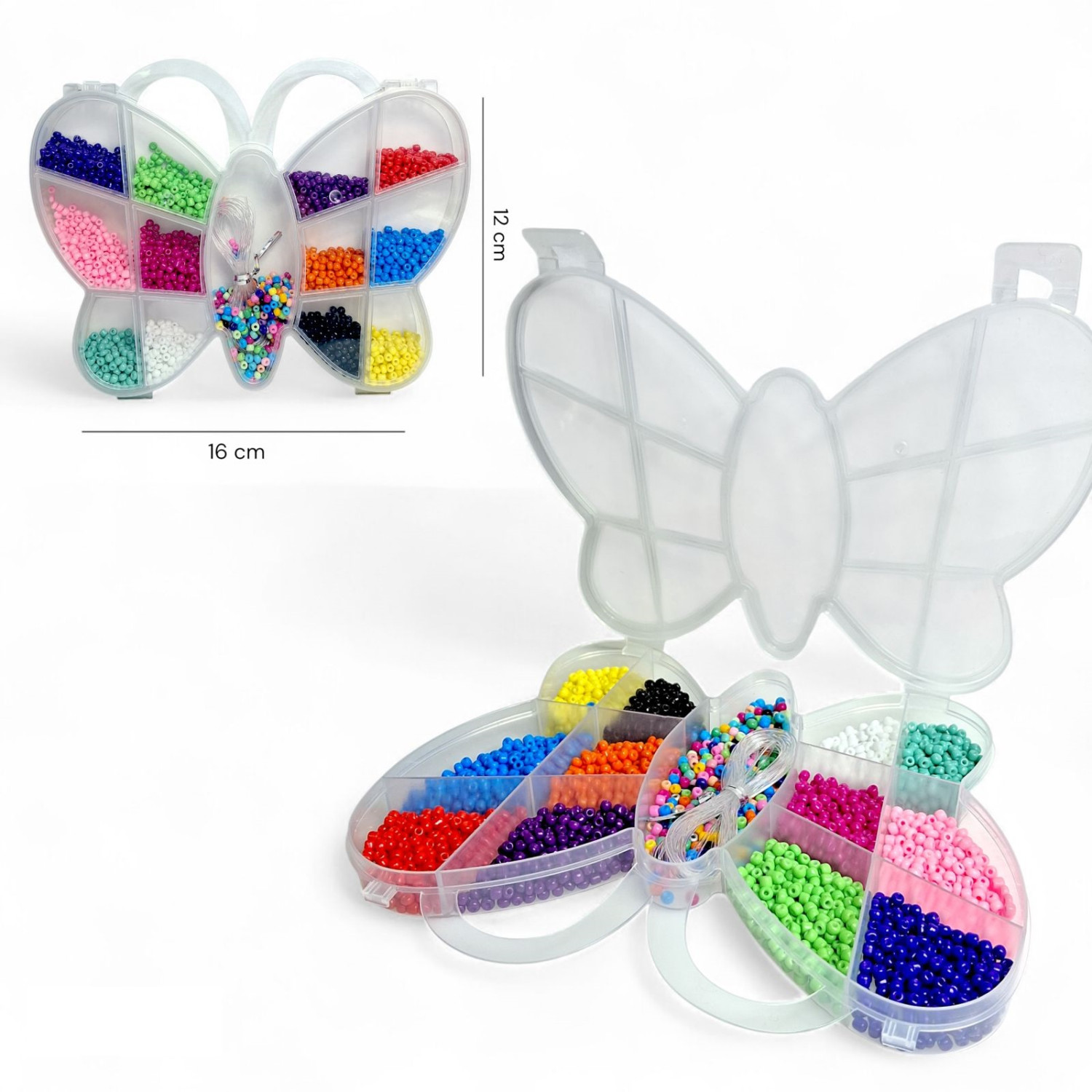 Особливості: В наборі різнокольоровий бісер. В комплекті волосінь. Упаковка: пластиковий бокс у формі метелика 12х16 см.