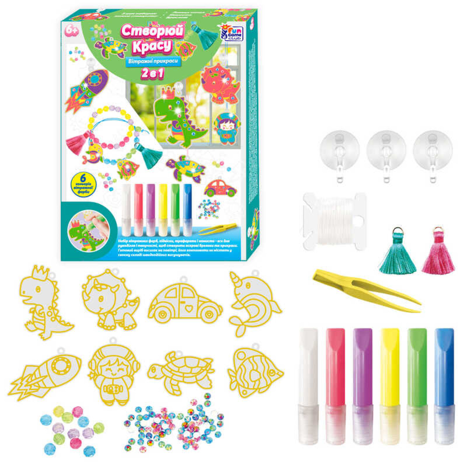 Набір для творчості "Створюй красу. Вітражні прикраси" від "4FUN Game Club" - це чудова можливість долучитися до створення оригінальних прикрас у вітражному стилі. Комплектація набору: основи зі штучного скла - 8 шт., вітражні фарби - 6 тюбиків по 6 мл, присоски - 3 шт., еластичний шнурок, кольорові намистини, стрази, китиці - 2 шт., пінцет - 1 шт.