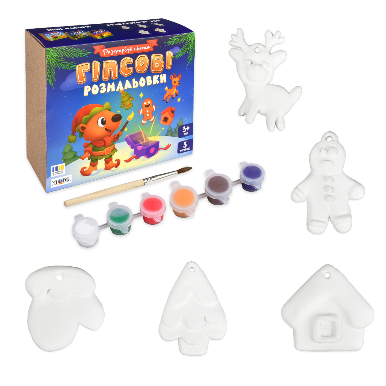 Створіть справжнє зимове диво власноруч! Цей набір дозволить вашій дитині поринути у чарівну атмосферу свят. У комплекті ви знайдете 5 гіпсових фігурок у вигляді улюблених новорічних символів: ялинки, оленя, пряникового чоловічка, будиночка та рукавички. Це ідеальна можливість провести час із дитиною разом, розвинути фантазію, дрібну моторику та створити власні унікальні новорічні прикраси або подарунки. Розмальовані фігурки стануть чудовим декором для ялинки, святкового столу або гарним доповненням до подарунка для близьких!