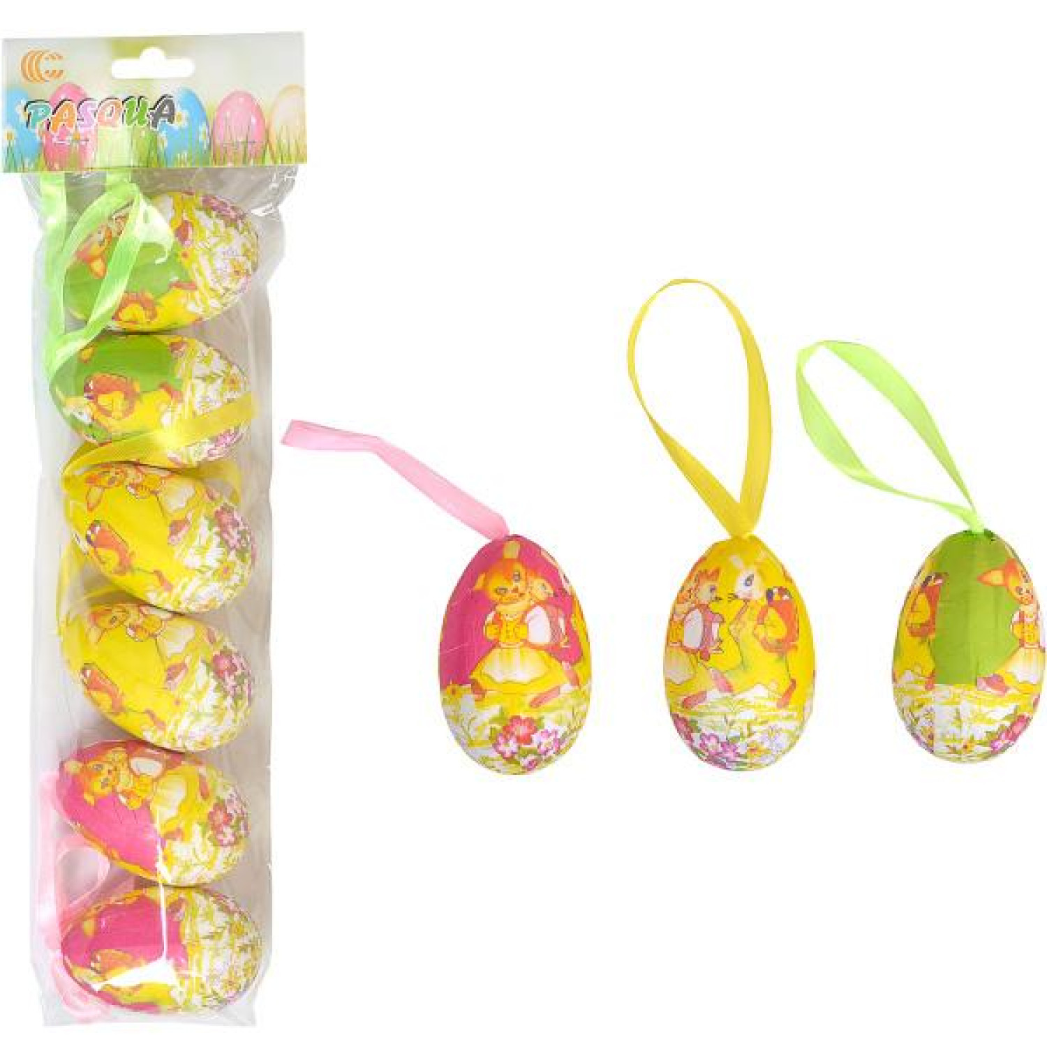 Матеріал: пінопласт, атласні петлі-стрічки, декоровані наклейкою з малюнком. Розмір яйця 6 * 3,5 см. В наборі 6 шт.