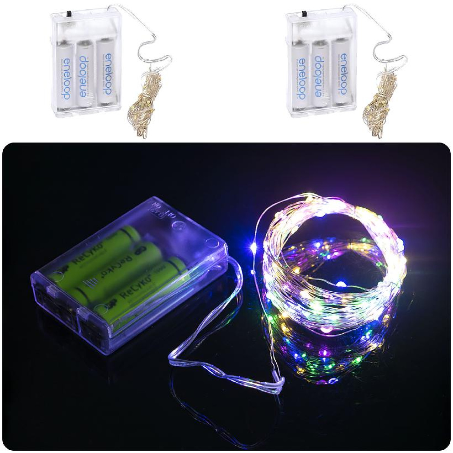 Яскрава електрогірлянда з різнокольоровими мікролампочками ідеально підійде для прикраси новорічної ялинки, інтерєру чи вікон. Матеріал - дріт, живлення від 3-х батарейок АА (у комплект не входять). Режим світіння: мультиколор, постійне світіння. Довжина: 10 м.