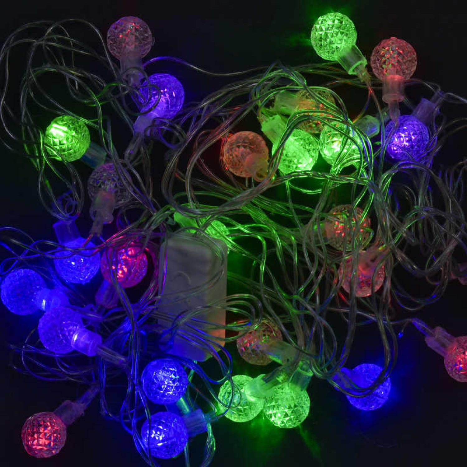 Гирлянда светодиодная Шарики мультиколор, упаковка - картонная коробка. 28 лампочек, длина 5 м. Гирлянда предназначена для внутреннего применения. Насадки в виде шариков с рифленой поверхностью. Подсветка - мультиколор. Питание - от сети 220 В. Размер одного шарика на гирлянде: 2*2*2 см .