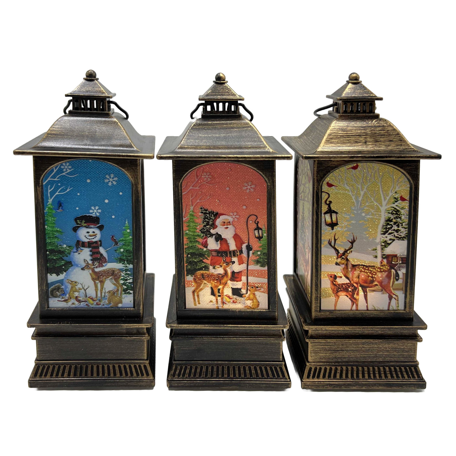 Ліхтар декор.новорічний світящ.LED "Д.Мороз, Сніговик.Олень" 19*7,8см,бронза, 3в.(1*96)