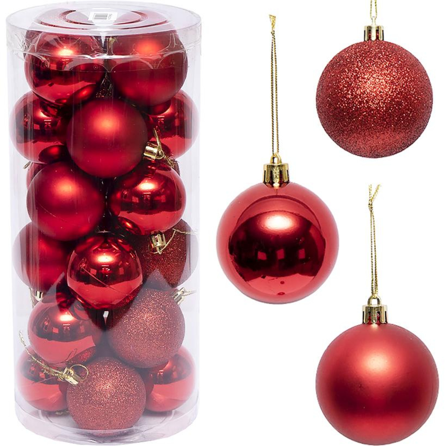 Набір містить 24 пластикові ялинкові кулі діаметром 8 см із поєднанням глянцевої, матової та блискучої поверхонь. Завдяки різним фактурам прикраси створюють розкішний святковий акцент на новорічній ялинці. Усі кулі мають підвіски для зручного розміщення та упаковані у прозорий тубус розміром 40х19 см, що зручно для зберігання та подарункового оформлення.
