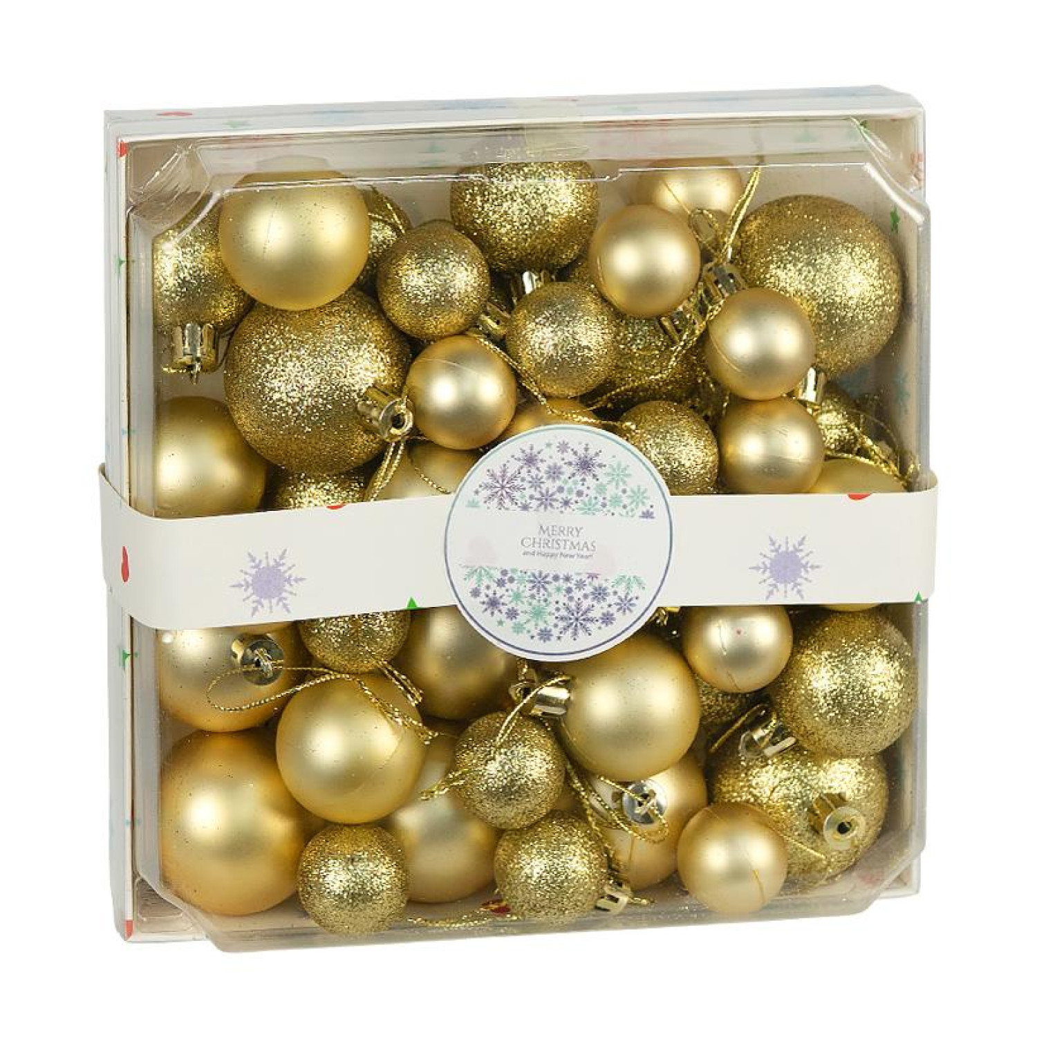 Набір ялинкових куль (44 шт) — стильний комплект новорічних прикрас для оформлення ялинки та святкового інтер’єру. У наборі кулі трьох розмірів: діаметром 5 см (10 шт), 4 см (14 шт) і 3 см (20 шт). Поверхня прикрас представлена у двох варіантах — глянцева та з блискітками, що надає ялинці яскравого та святкового вигляду. Усі кулі мають підвіски й повністю готові до використання. Упаковка: коробка 21х21х7 см, зручна для зберігання та подарункового оформлення.