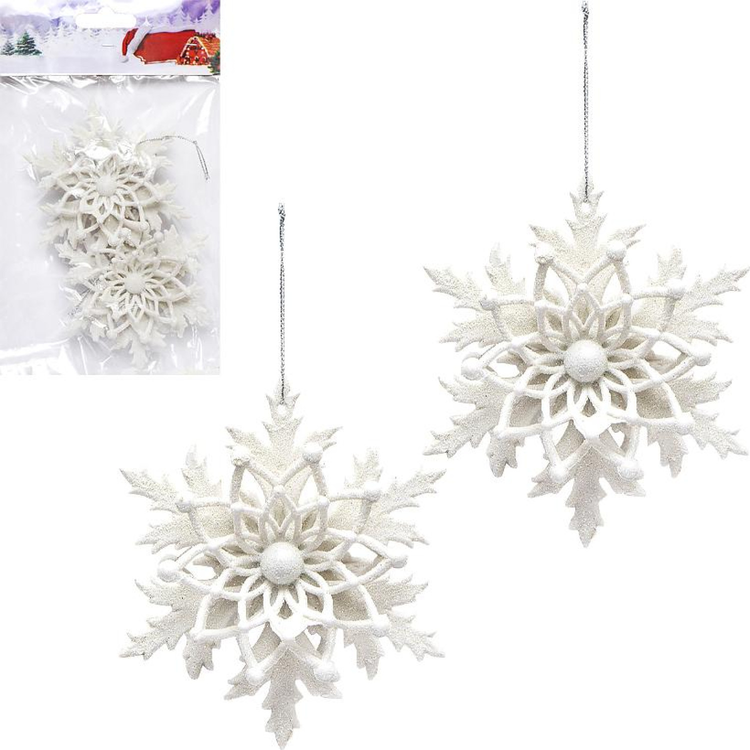 Набір ялинкових прикрас містить 2 іграшки розміром 12x12 см. Виготовлені з пластику, прикраси білого кольору з глітером.