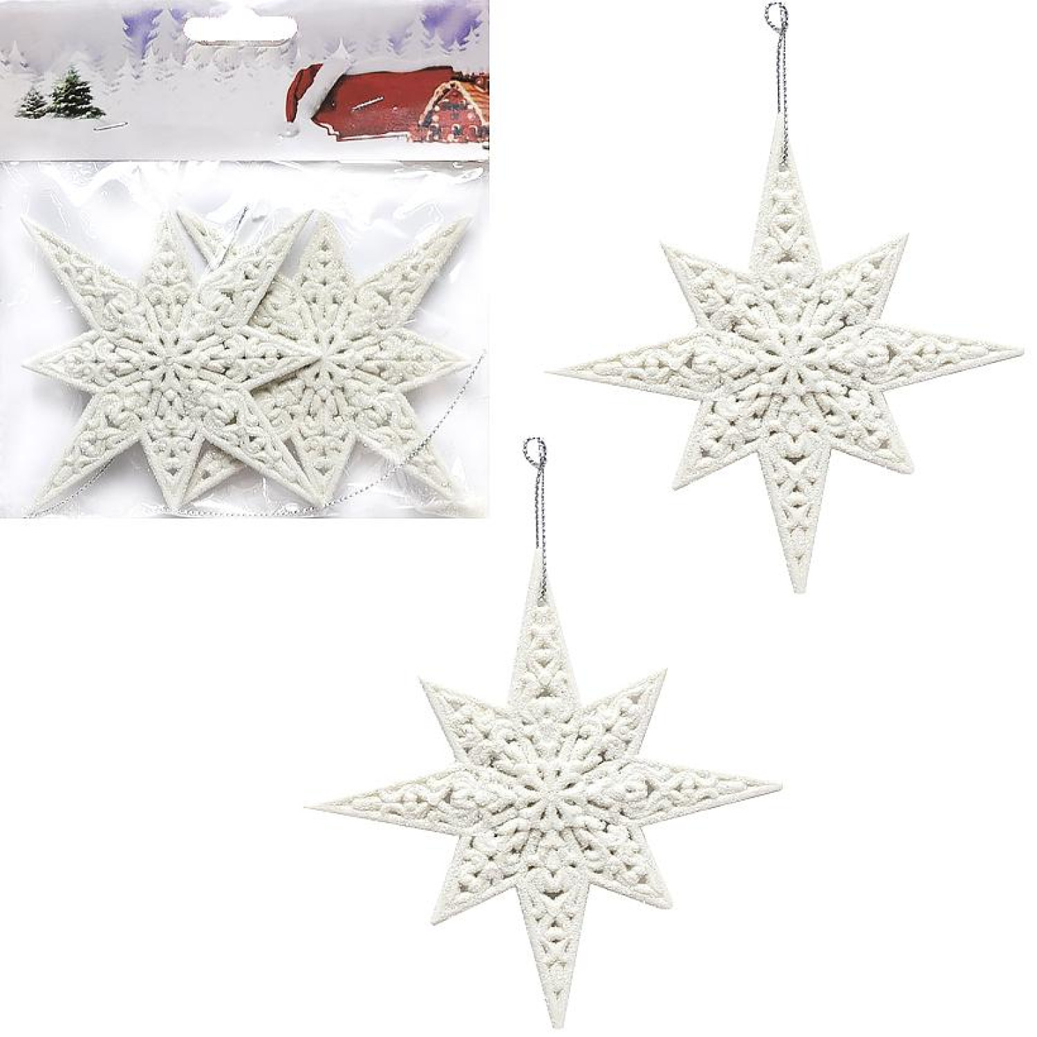 Набір ялинкових прикрас складається з двох пластикових зірок з глітером. Розмір кожної іграшки становить 12х12 см. Колір прикрас білий.