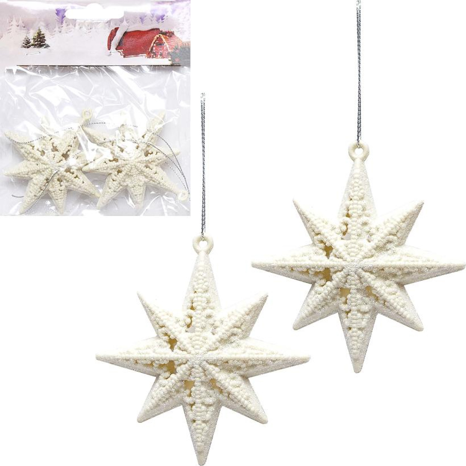 Набір містить дві ялинкові прикраси розміром 9x9 см. Виготовлені з пластику, прикраси білого кольору з глітером.