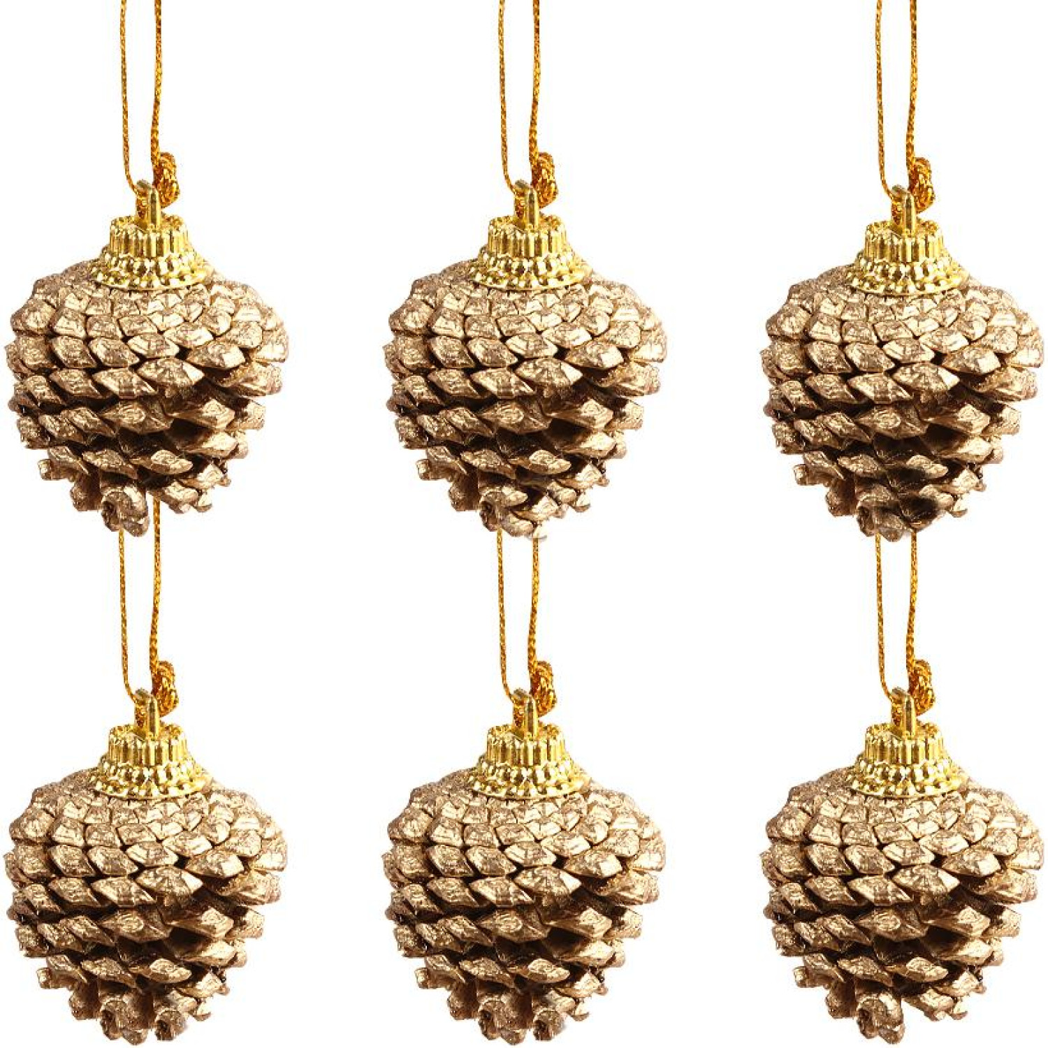 Набір ялинкових прикрас "Шишки" містить 6 штук. Прикраси виготовлені з ялинкових шишок, покритих золотою фарбою. Розмір кожної іграшки становить 6х3 см.
