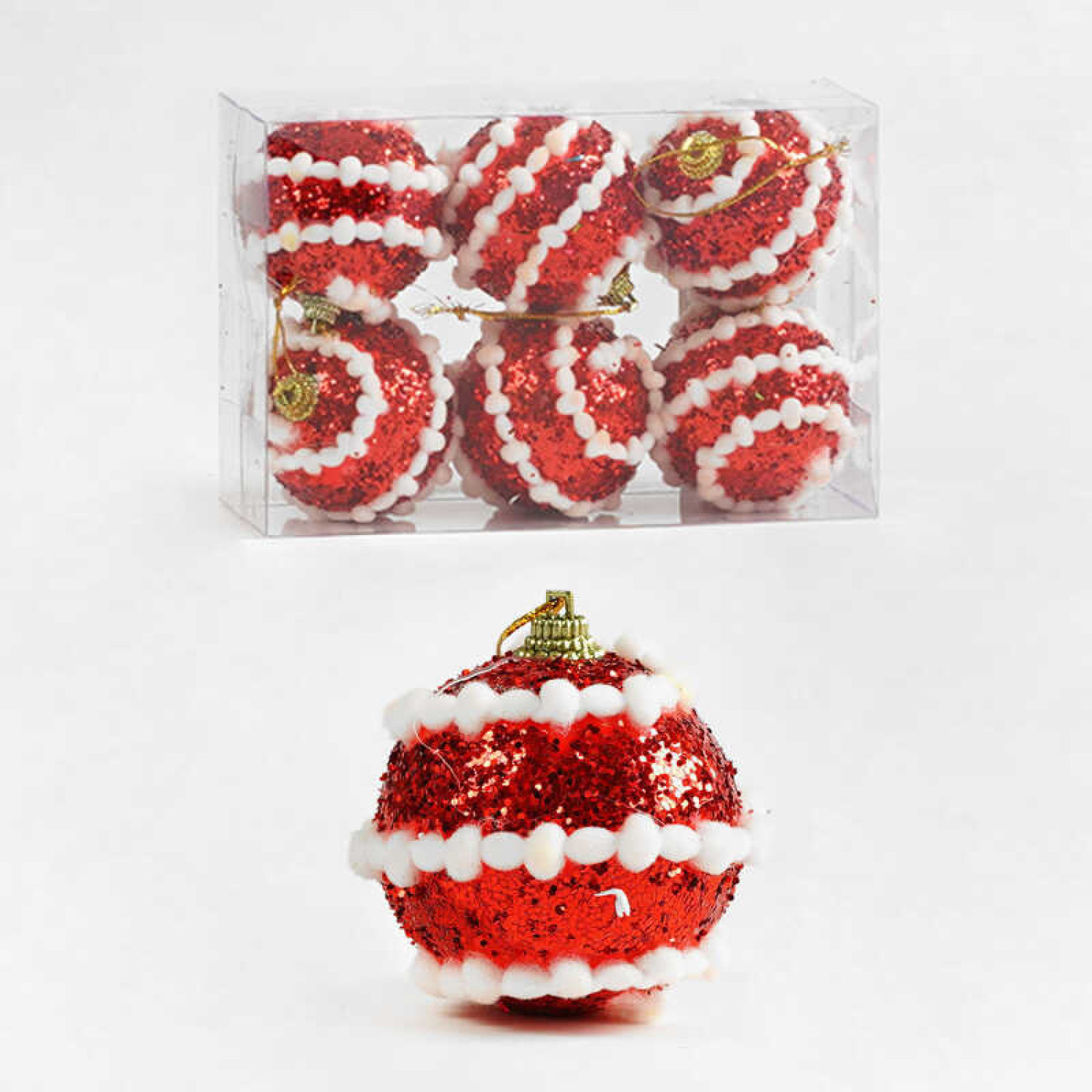 Новорічна прикраса на ялинку. Матеріал - пластик. Прикраса - паєтки. Діаметр - 6 см. Кількість в пакуванні - 6 шт.