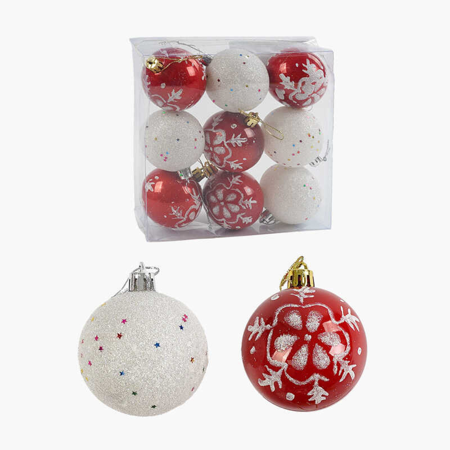 Діаметр - 5,5 см. Матеріал - пластик. Декор - глітер. Кількість в пакуванні - 9 шт. Розмір упаковки: 24.5*5*19.5 см