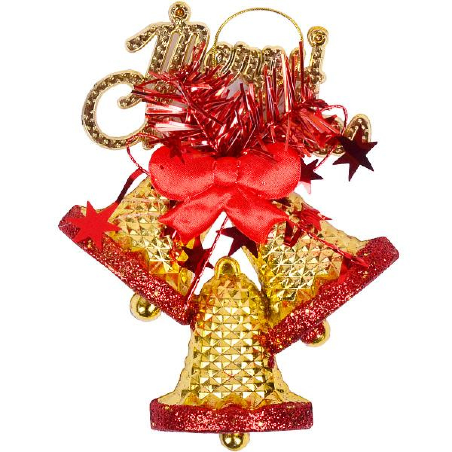 Новорічна підвісна прикраса у вигляді трьох різьблених золотих дзвіночків. Виготовлена з пластмаси. Розмір: 15*12,5 см.