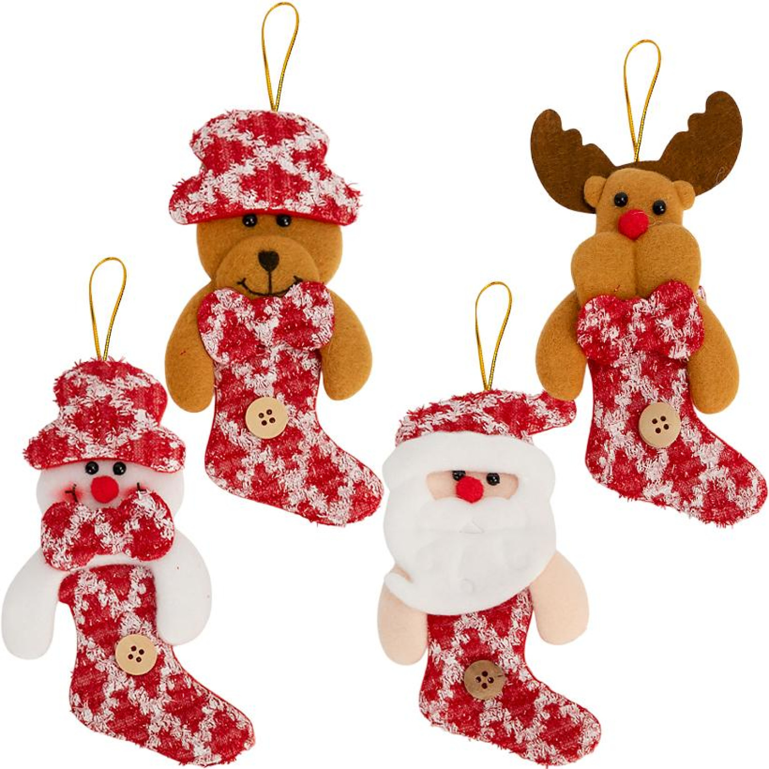 Ялинкова іграшка "Новорічний чобіток із фігуркою" - оригінальна прикраса у вигляді Санти, сніговика, ведмедика та оленя. Яскравий червоно-білий чобіток із ґудзиком доповнений м'якою фігуркою, що створює святковий настрій та затишок. Іграшка виготовлена з текстилю, приємного на дотик, та має петельку для підвішування. Розмір 16х9 см.