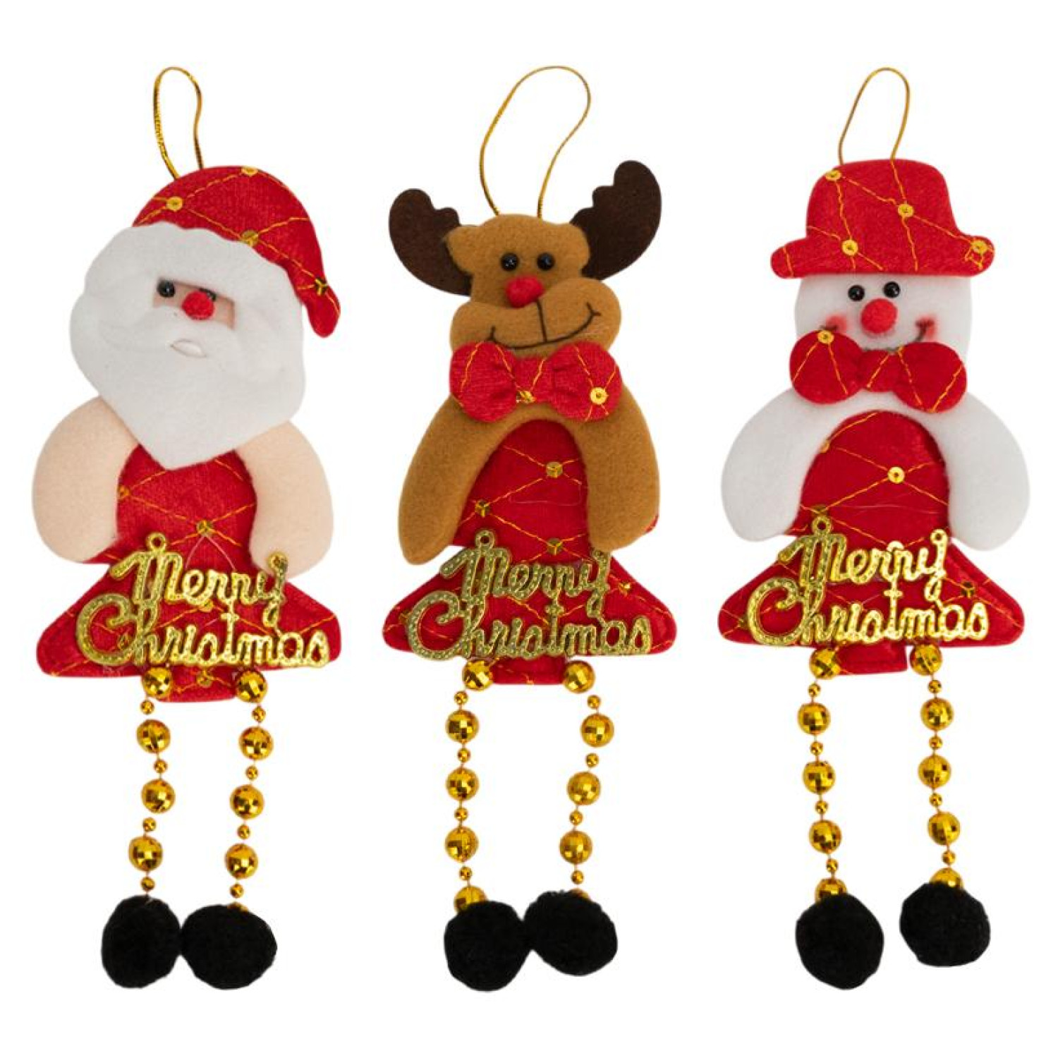 Ялинкова іграшка "Новорічний декор Merry Christmas" - прикраса у вигляді Санти, сніговика та оленя, виконана в червоно-золотій гамі. Кожна фігурка доповнена блискучим написом Merry Christmas та підвісними ніжками із золотих намистин із м'якими помпонами. Розмір іграшки - 24х10 см.
