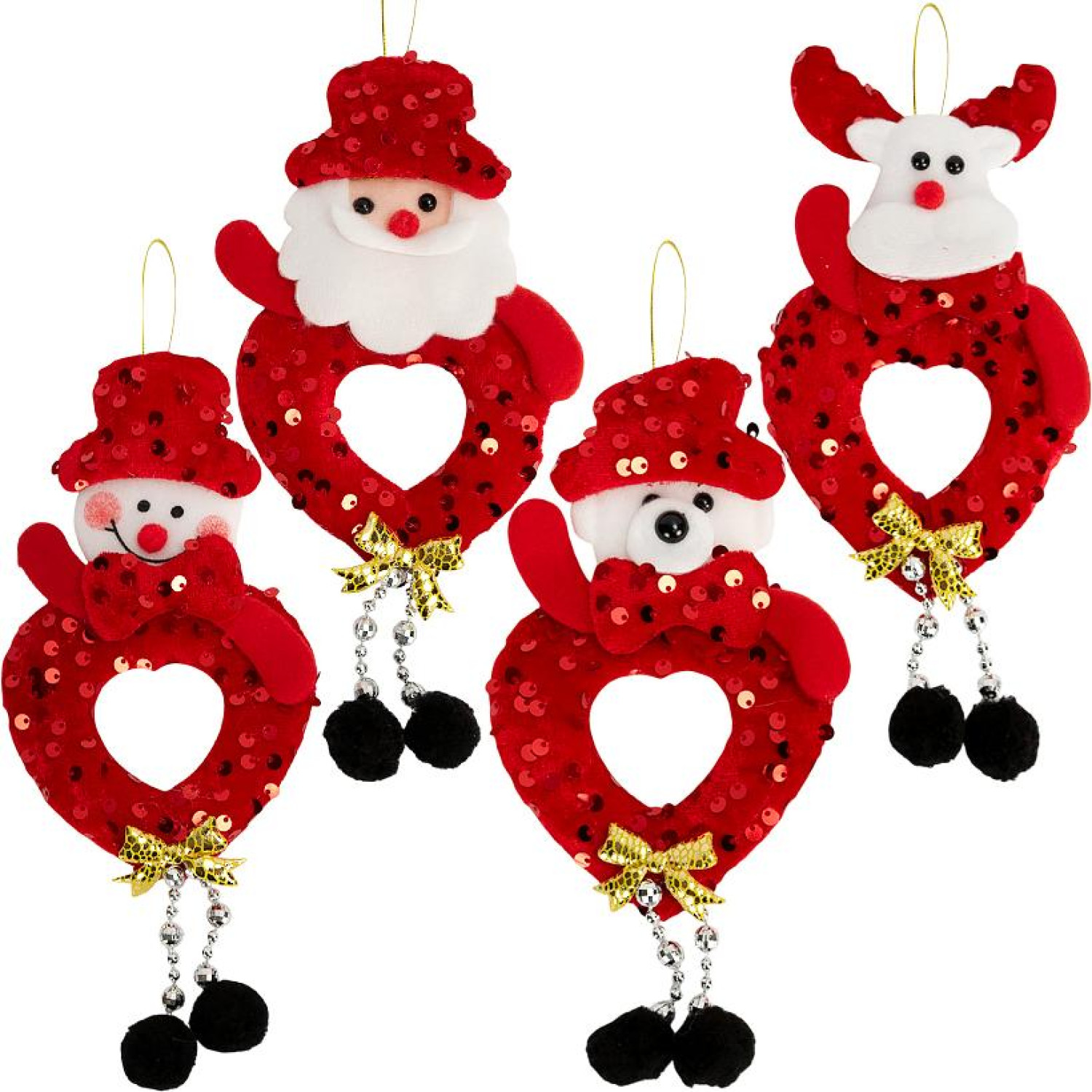 Новорічні персонажі з сердечком - стильні прикраси для ялинки, які створять святковий настрій та затишок. Фігурки виконані у яскраво-червоному кольорі з блискучими паєтками, золотим бантом і підвісом, що робить їх ефектними та помітними. Прикраса підходить для декору ялинки, інтер'єру або оформлення подарунків. Розмір: 20х12 см