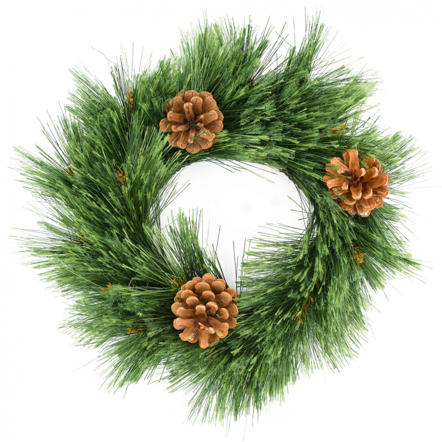 Гарний пишний вінок, прикрашений натуральними лісовими шишками - традиційний підвісний декор для вхідних дверей будинку і офісу у період новорічних свят. Всі матеріали екологічно чисті, мають протипожежні властивості. Висока якість матеріалу дозволяє виробу бути не тільки оригінальним і красивим, а ще й довговічним. Матеріал: ПВХ плівка зеленого кольору, дріт. Ширина хвої - 6 см. Діаметр: 15 см.