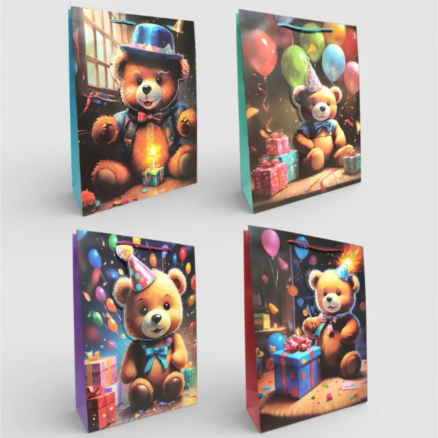 Подарунковий пакет картон 200грм, "Святковий ведмедик" МІКС 4 види, 26*32*10см 6 шт. в уп. /12/