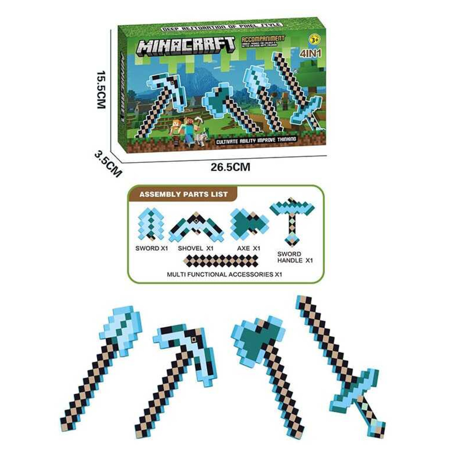 Особливості: В комплекті 4 аксесуари - лопата, кірка, меч, сокира. Упаковка: коробка 15,5х26,5х3,5 см.