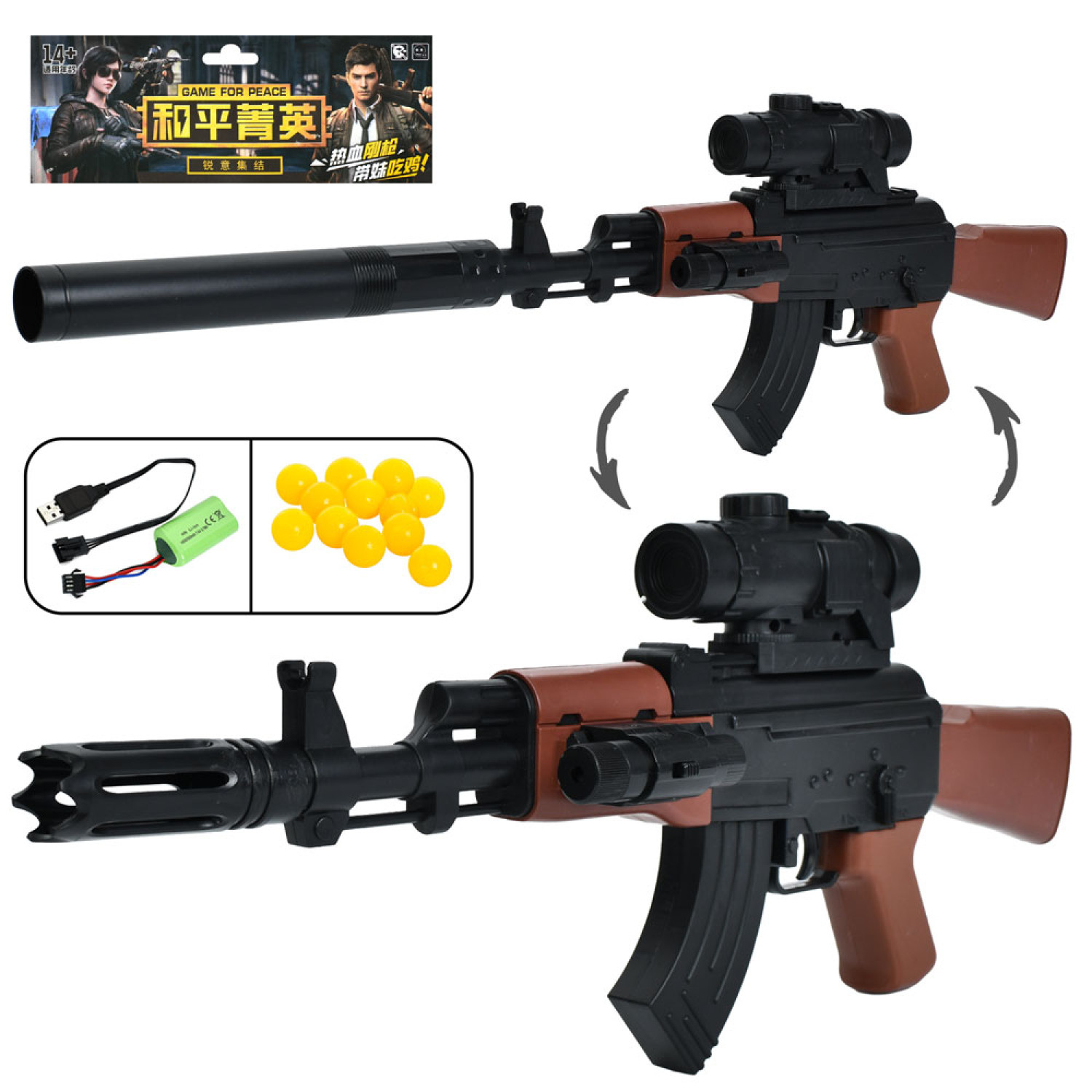 Особливості: Розмір іграшкової зброї 67 см. Працює від акумулятора. Стріляє пластиковими кулями. Лазерний приціл. USB зарядне в комплекті. Упаковка: пакет з хедером 40х21х5 см.