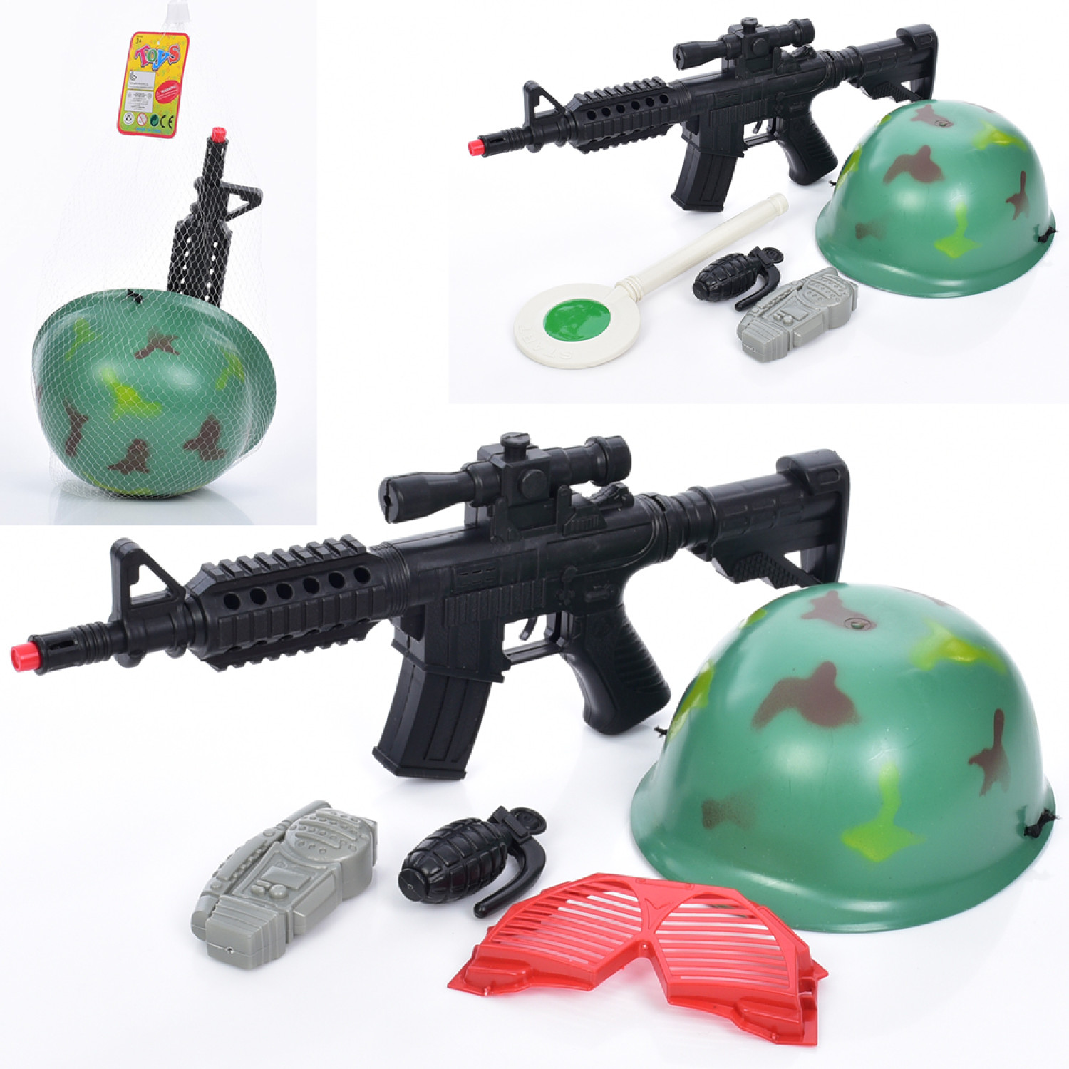 Набір зі зброєю автомат 38см,трищітка,шолом,рація,окуляри,2 види, в сітці 50-12-8см /72/
