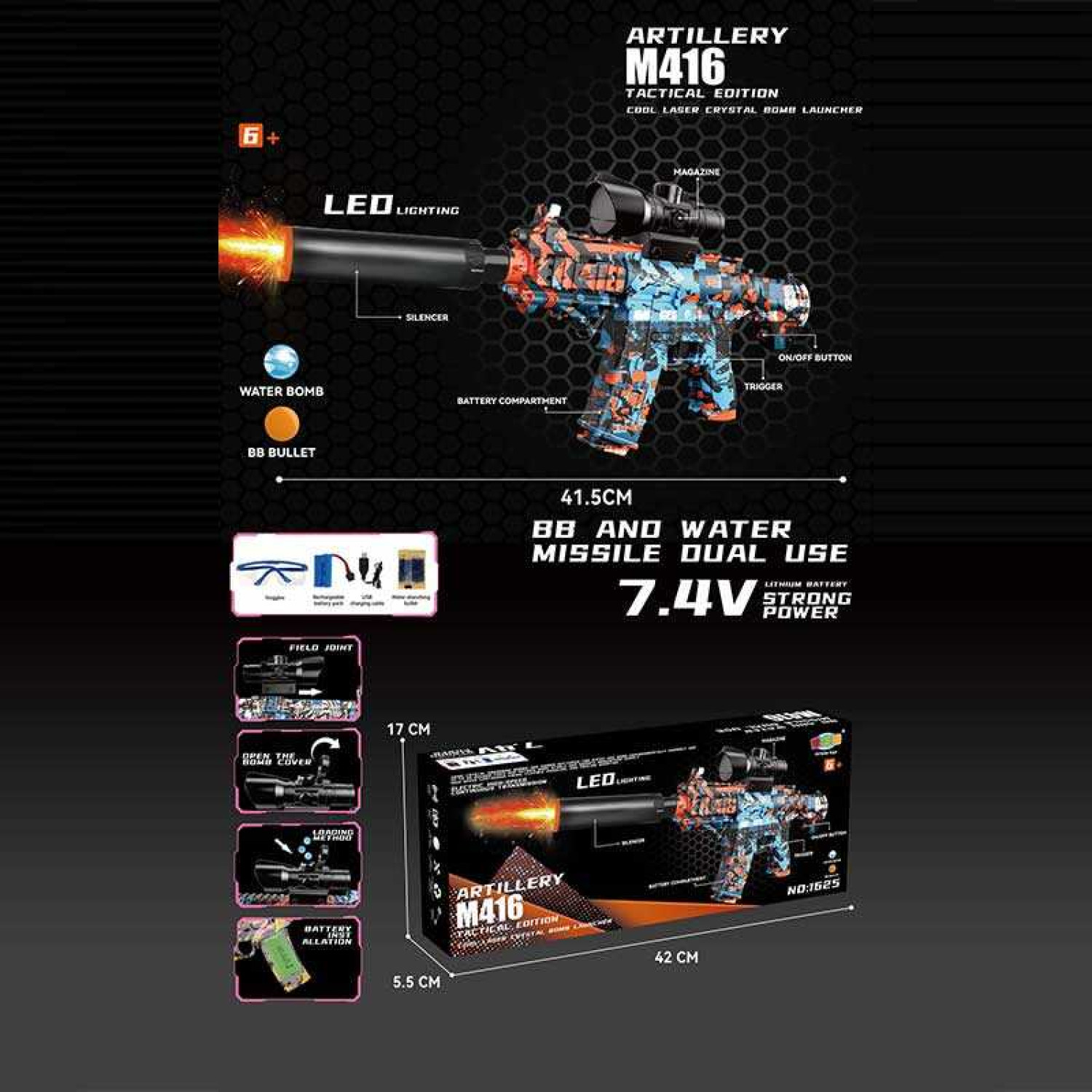 Особливості: Розміри: 48х4.5х21 см. Автомат має автоматичний принцип роботи. Працює від акумулятора 7.4 V, який разом із дротом для його підзаряджання включено до набору. До набору додано магазин, стилізований під приціл. У комплект включено глушник із підсвічуванням. Підсвічування працює від вбудованого акумулятора (зарядний пристрій у комплекті). Стріляє орбізами (додані до набору). Захисні окуляри в комплекті. Яскравий дизайн.