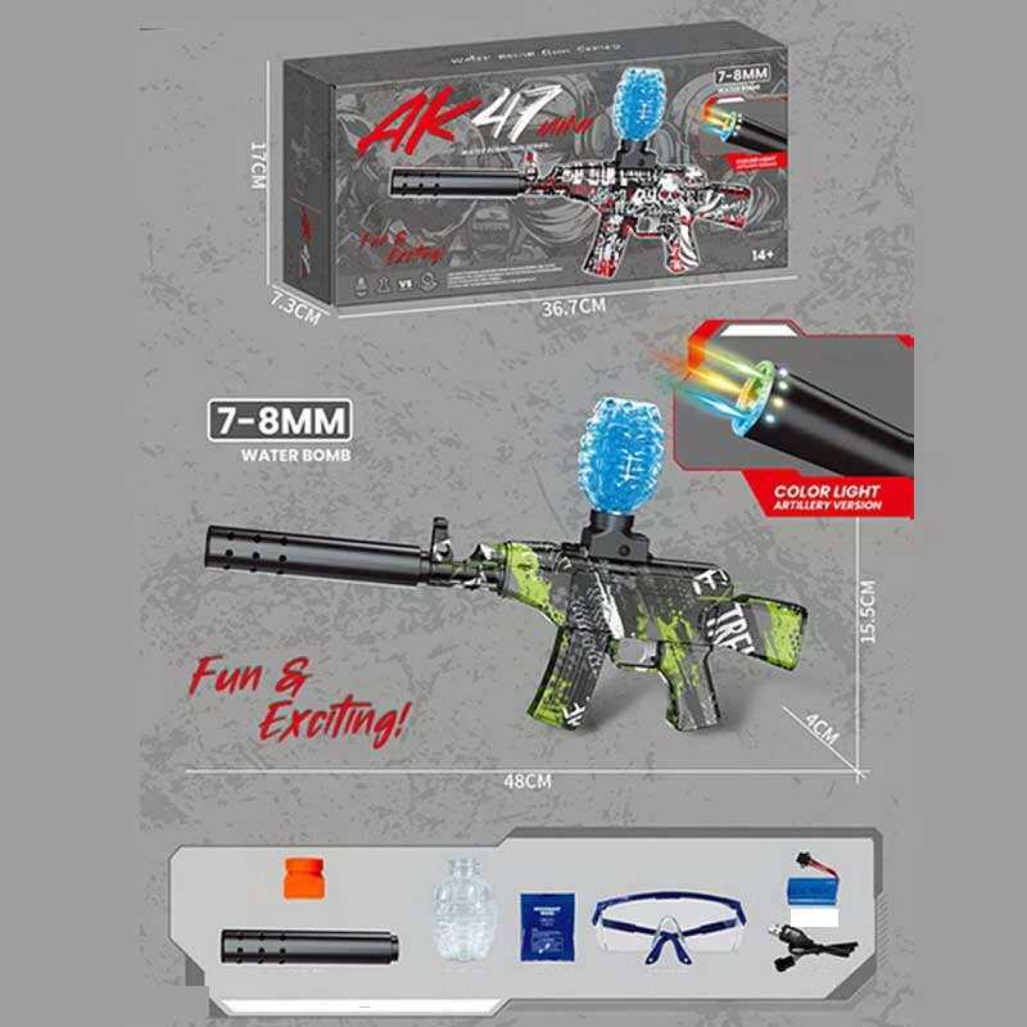 Особливості: Розмір 48.5х3.5х16см. Підсвічування на кінці глушника. Механічний принцип роботи. Пачка орбізів. Велика потужність та тривалість роботи на одному заряді. Працює від акумулятора 7.4V (додається). Наявний USB-кабель для заряджання та окуляри. Орбізи вставляються у баночку у вигляді гранати, що розташована на корпусі зверху. Набір має тематичне забарвлення. Виконаний з міцного пластику.