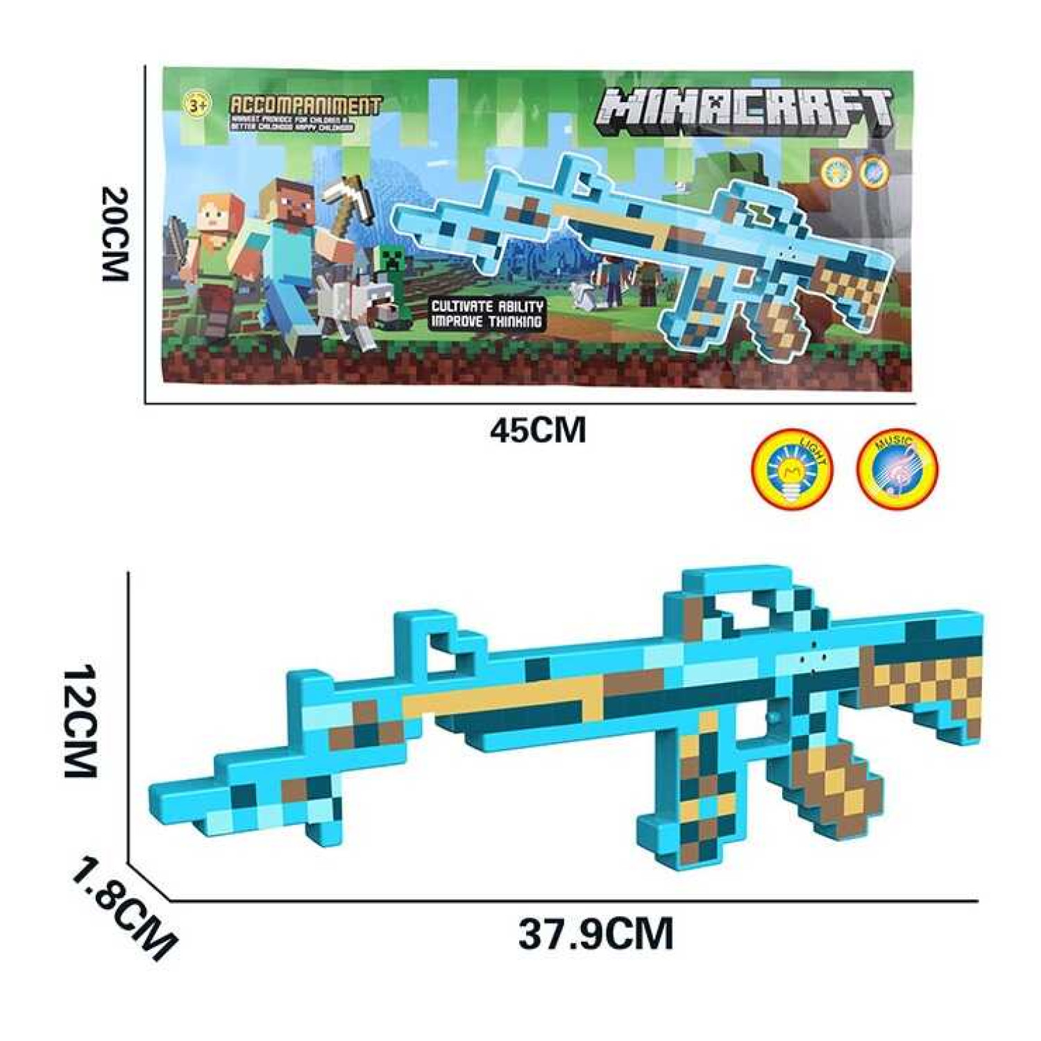 Особливості: Іграшку виконано у стилі популярної комп'ютерної гри. Розмір автомата 37,9х1,8х12 см. Підсвічування, звуки. Працює від 2-х батарейок типу "АА" (не додаються). Виконано з пластику.