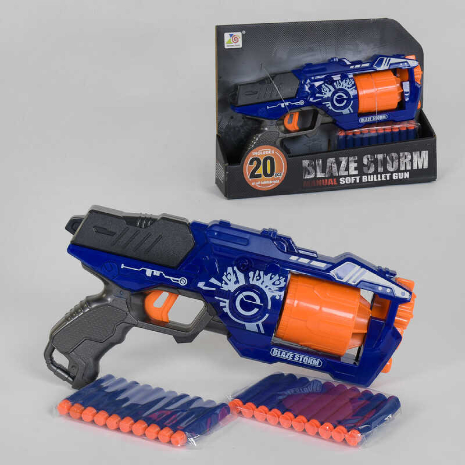 Бластер с патронами, упаковка - демонстрационная картонная коробка. В комплекте с оружием 20 поролоновых пуль с присосками. Размеры пистолета: 31*18 см. Материал: пластик.