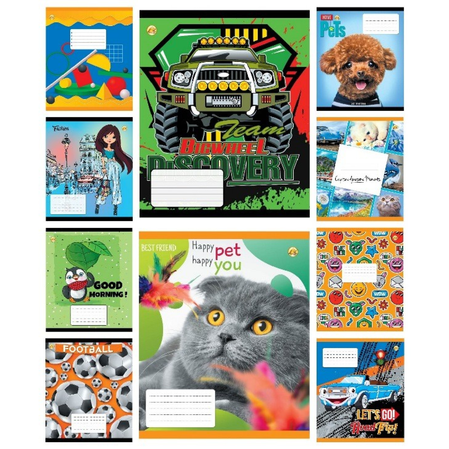Зошит з повнокольоровою картонною твердою обкладинкою. Внутрішній блок - папір офсетний, білизна 98%, щільність внутрішнього блока 55 г/м2, поля червоні. Обкладинка - крейдований папір щільністю 170 г/м2. Ліновка - клітинка, 12 аркушів. У наборі 25 зошитів.